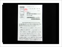過払請求で、本当にお金が戻ってくるか悩んでいる時に、御社のホームページを見つけました。東京なので、どの様に進んで行くのか不安も有りましたが、随時書類を送って頂き、安心して結果を待つ事ができ、満足しております。ありがとうございました。