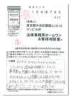 ラジオでホームワンのコマーシャルをしていたので過払い金の相談をしたところ、事務員さん、弁護士の先生の対応は丁寧で分かりやすかったです。弁護士さんと話をするのは、はじめてでドキドキでしたが、相談して良かったです。【ありがとう、ございます。】